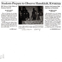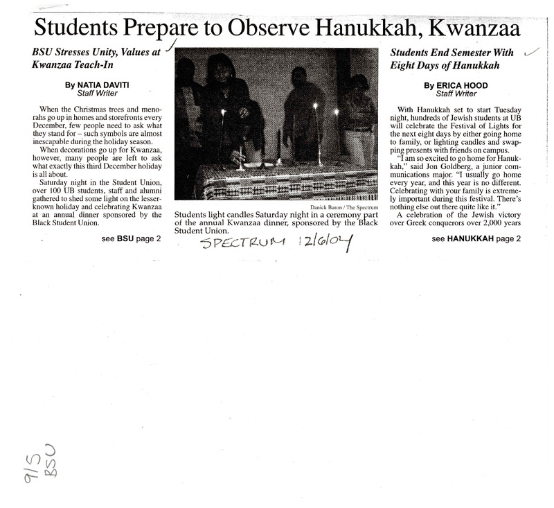 Photocopied newspaper clippings of The Spectrum article "Students Prepare to Observe Hanukkah, Kwanzaa" which includes two articles: "BSU Stresses Unity, Values at Kwanzaa Teach-In" by Natia Daviti and "Students End Semester With Eight Days of Hanukkah" by Erica Hood, December 6, 2004. Second page contains continuation of the article on BSU's celebration of Kwanzaa.