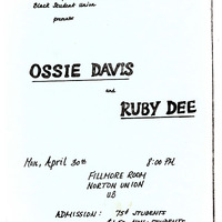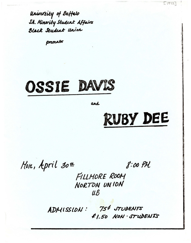 Photocopied hand-drawn flyer for Ossie Davis and Ruby Dee's visit to the University at Buffalo on April 30, 1972. Event co-sponsored by the Student Association for Minority Student Affairs and the Black Student Union.