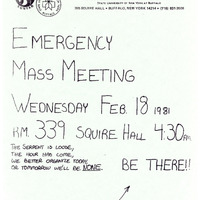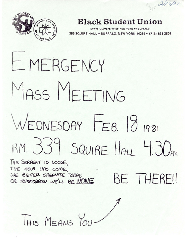 Hand-drawn flyer for an emergency Black Student Union Mass Meeting on February 18, 1981.