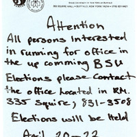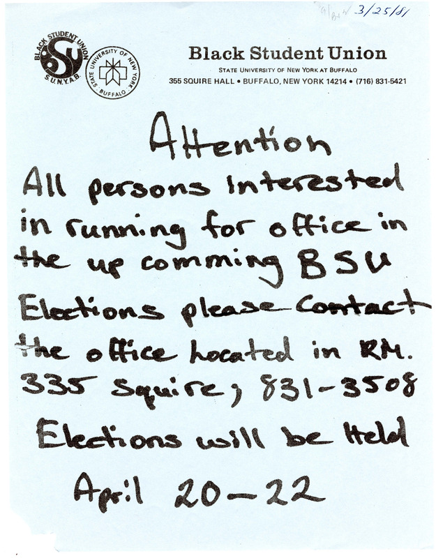 Handwritten flyer for the Black Student Union's elections on April 20-22, 1981.