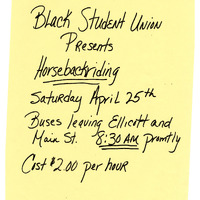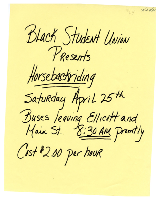 Handwritten flyer for a horseback riding event presented by the Black Student Union on April 25, 1981.