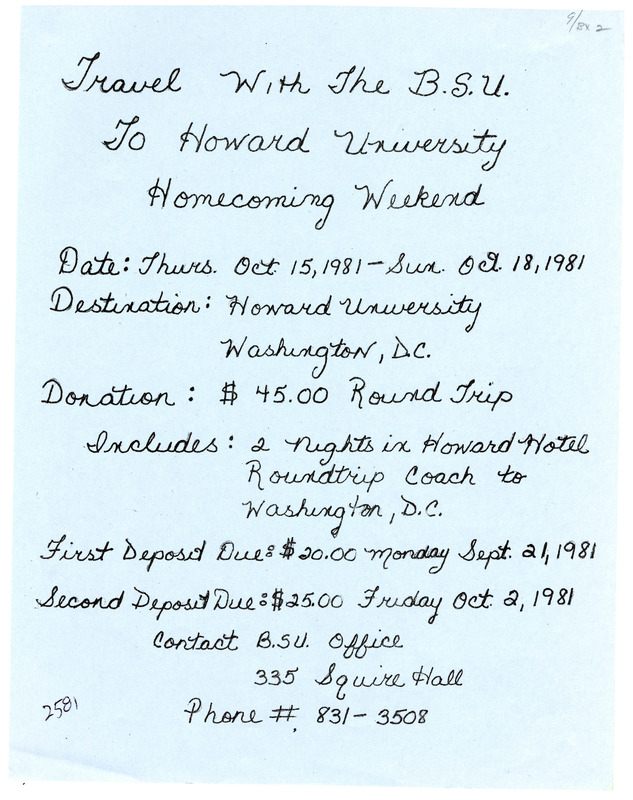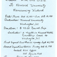 Handwritten flyer for the Black Student Union's homecoming weekend trip to Howard University from October 15-18, 1981.