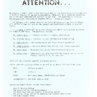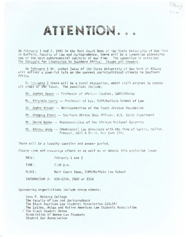 Handwritten flyer announcing a symposium being held in UB's "Moot Court Room" on North Campus on February 1-2, 1983.