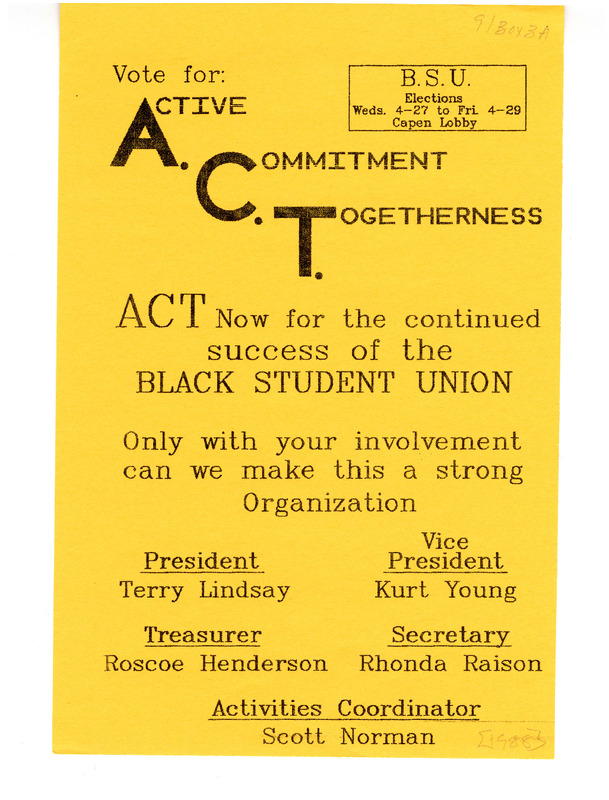 Hand-drawn flyer for Black Student Union's 1988 election, April 27-29, 1988.