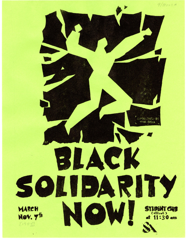 Hand-drawn flyer for the Black Student Union's black solidarity march at Ellicott on North Campus on November 7, 1988.