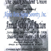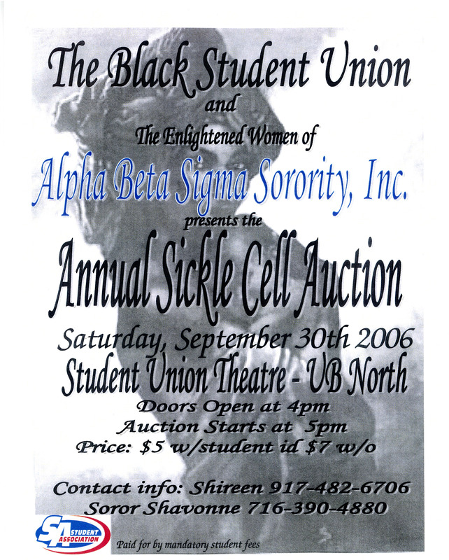 The Black Student UnionandThe Enlightened Women ofAlpha Beta Sigma Sorority, Inc.presents theAnnual Sickle Cell AuctionSaturday, September 30th 2006Student Union Theatre - UB NorthDoors Open at 4pmAuction Starts at 5pmPrice: $5 w/student id $7 w/oContact info: Shireen 917-482-6706Soror Shavonne 716-390-4880Student AssociationPaid for by mandatory student fees
