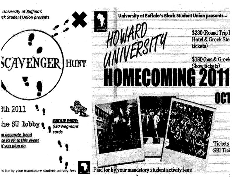 University at Buffalo'sBlack Student Union presentsSCAVENGER HUNG[?] 8th 2011the SU lobbyGROUP PRIZE:$30 Wegmans cards[?] an accurate head[?] please RSVP to this event[?] if you plan onpaid for by your mandatory student activity feesUniversity at Buffalo's Black Student Union presents...HOWARD UNIVERSITY$230 (Round TripHotel & Greek Ste[?]tickets)$180 (bus & GreekShow tickets)HOMECOMING 2011OCTTicketsSBI Ticket [?]Paid for by your mandatory student activity fees