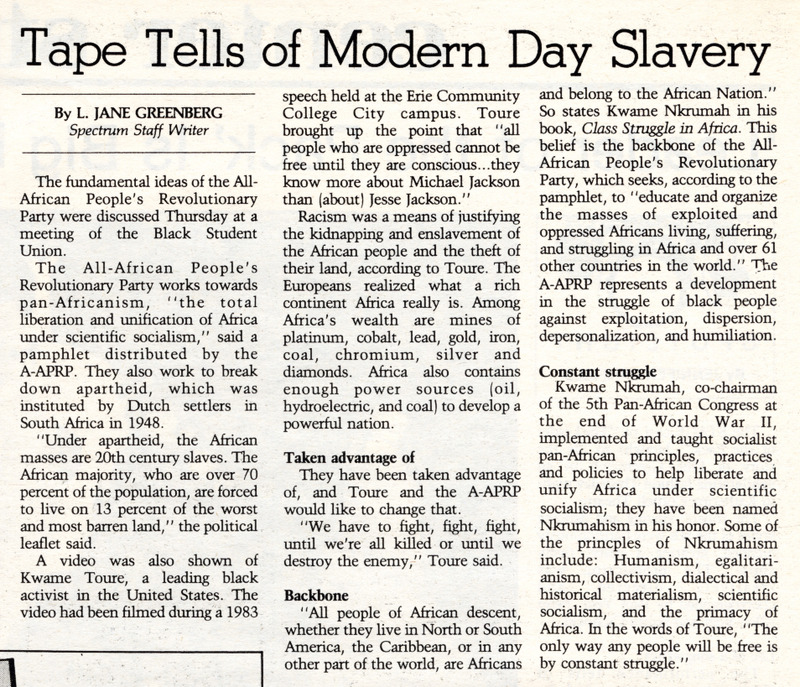Article from student newspaper The Spectrum, "Tape Tells of Modern Day Slavery" by L. Jane Greenberg, November 11, 1987.