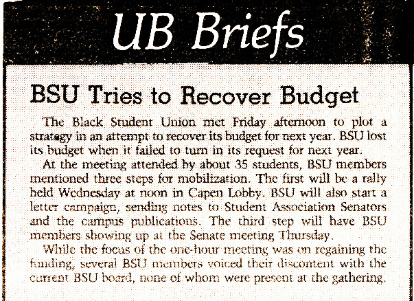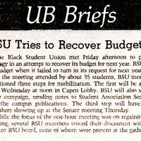 Article from "UB Briefs" section of student newspaper The Spectrum, "BSU Tries to Recover Budget," February 24, 1988.