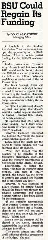 Article from student newspaper The Spectrum, "BSU Could Regain Its Funding" by Douglas Oathout, March 2, 1988.