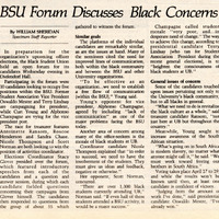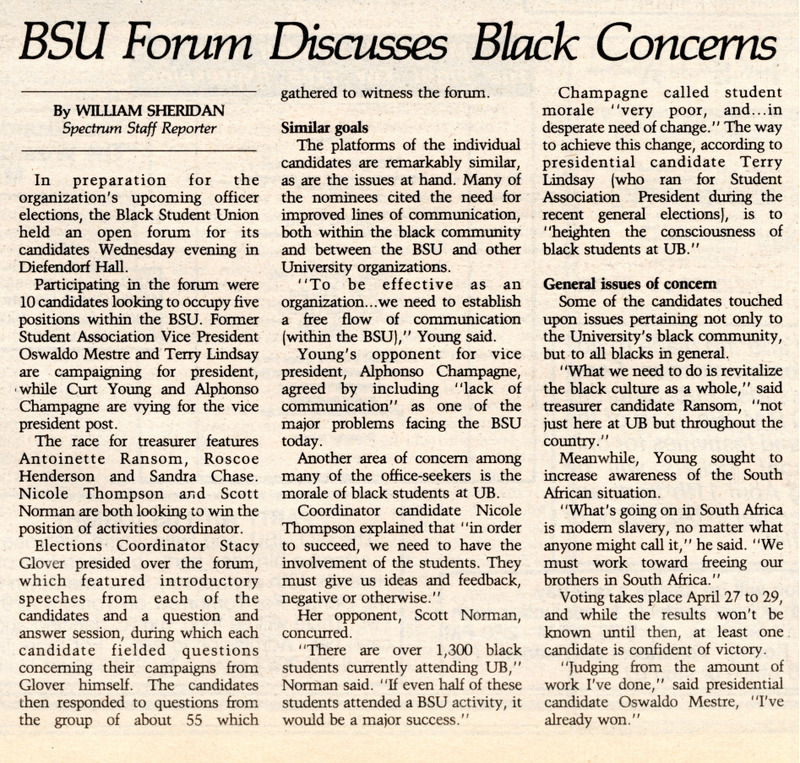 Article from student newspaper The Spectrum, "BSU Forum Discusses Black Concerns" by William Sheridan, April 22, 1988.
