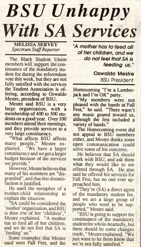 Article from student newspaper The Spectrum, "BSU Unhappy With SA Services" by Melissa Servey, November 14, 1988.