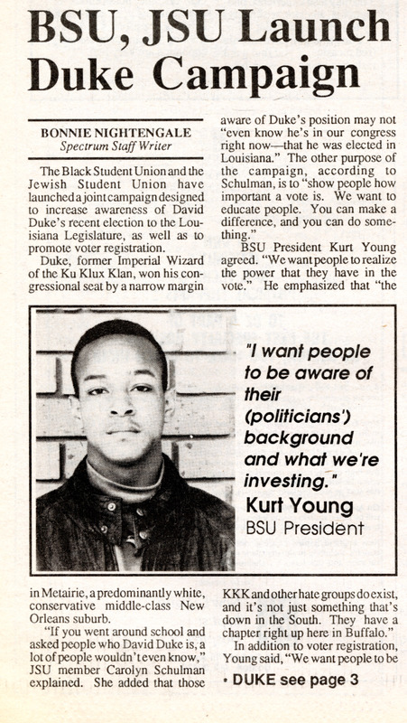 Article from student newspaper The Spectrum, "BSU, JSU Launch Duke Campaign" by Bonnie Nightengale, April 5, 1989.