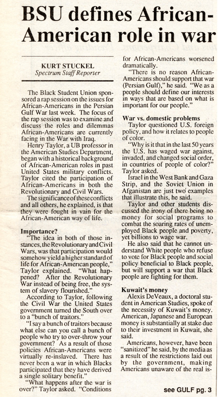 Article from student newspaper The Spectrum, "BSU defines African-American role in war" by Kurt Stuckel, February 22, 1991.