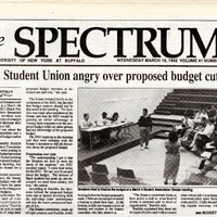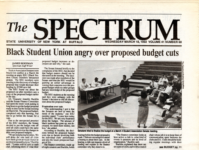 Article from student newspaper The Spectrum, "Black Student Union angry over proposed budget cuts" by James Hoffman, March 18, 1992.