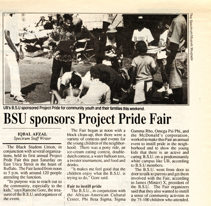 Article from student newspaper The Spectrum, "BSU sponsors Project Pride Fair" by Iqbal Afzal, September 11, 1991.