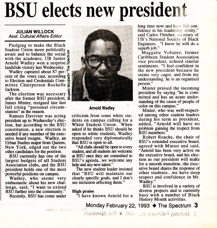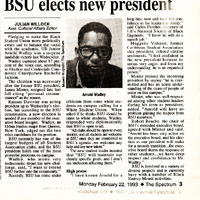 Article from student newspaper The Spectrum, "BSU elects new president" by Julian Willock, February 22, 1993.