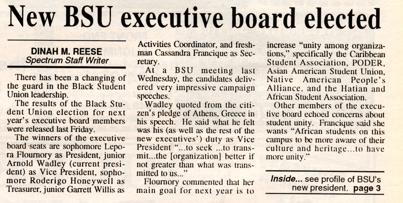 Article from student newspaper The Spectrum, "New BSU executive board elected" by Dinah M. Reese, April 28, 1993.