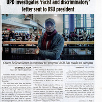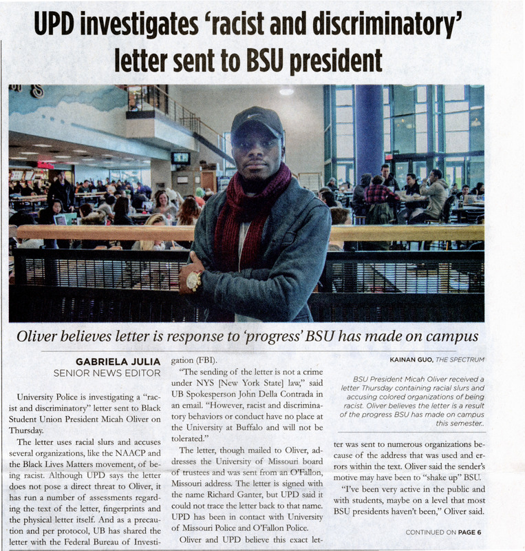 Article from student newspaper The Spectrum, "UPD investigates 'racist and discriminatory' letter sent to BSU president' by Gabriela Julia, December 9, 2015.