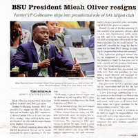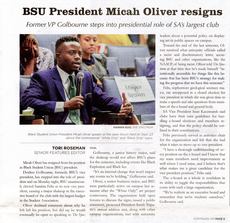 Article from student newspaper The Spectrum, "BSU President Micah Oliver resigns" by Tori Roseman, February 3, 2016.