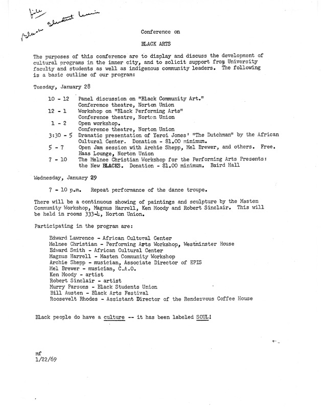 - Conference on BLACK ARTS schedule, January 22, 1969
