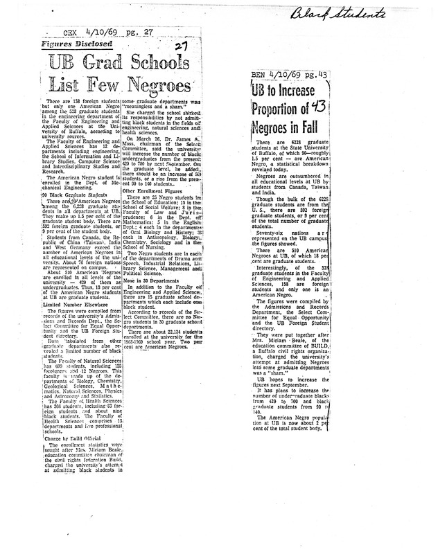 Photocopied newspaper clippings of Courier Express and Buffalo Evening News articles "UB Grad Schools Lost Few Negroes" and "UB to Increase Proportion of 43 Negroes in Fall," April 10, 1969.