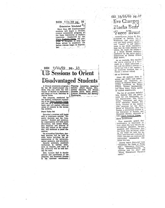 Photocopied newspaper clippings of Buffalo Evening News and Courier Express articles "Orientation Scheduled," "UB Sessions to Orient Disadvantaged Students" and "Eve Charges Blacks Bear 'Force' Brunt," December 18, 1969.