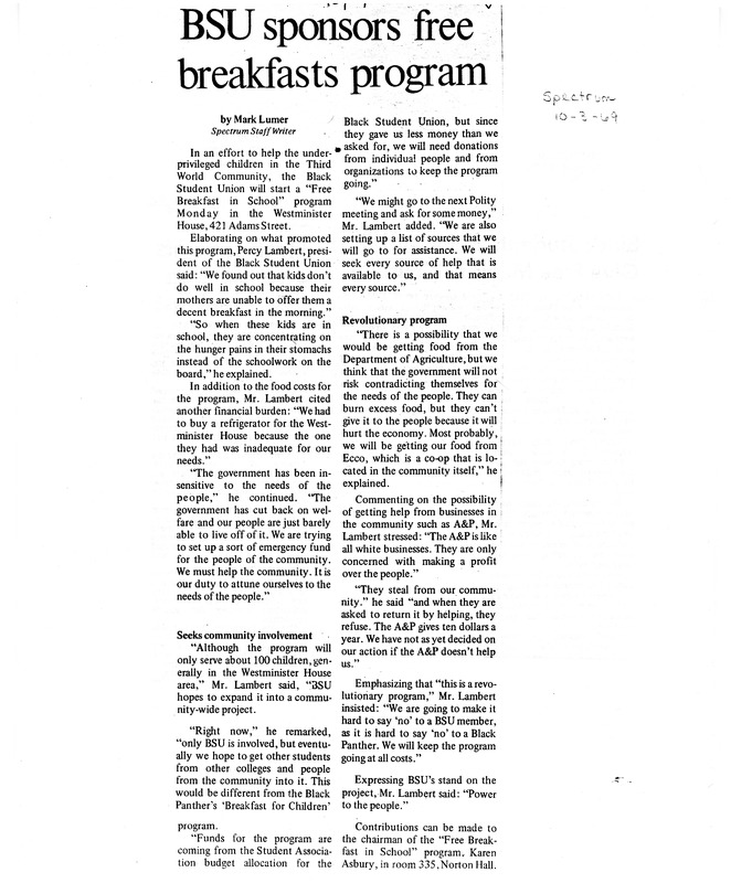 - Photocopied newspaper clipping of The Spectrum article "BSU sponsors free breakfasts program" by Mark Lumer, October 3, 1969.