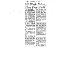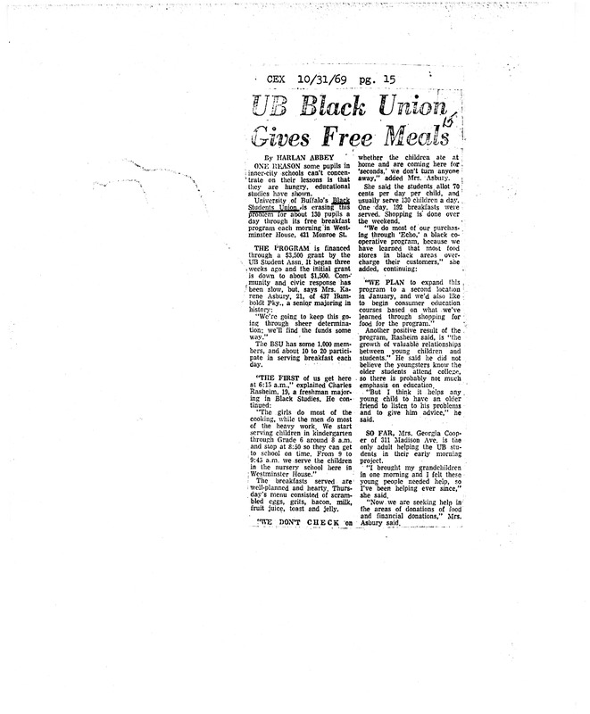 Photocopied newspaper clipping of Courier Express article "UB Black Union Gives Free Meals" by Harlan Abbey, October 31, 1969.