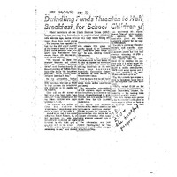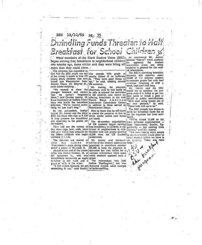 - Photocopied newspaper clipping of Buffalo Evening News article "Dwindling Funds Threaten to Halt Breakfast for School Children," December 10, 1969.