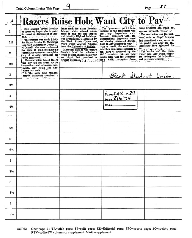 Photocopied newspaper clipping of Courier Express article "Razers Raise Hob; Want City to Pay," August 6, 1974.
