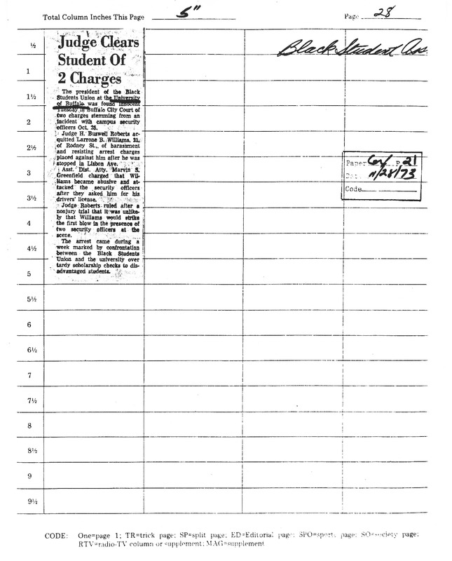 Photocopied newspaper clipping of Courier Express article "Judge Clears Student Of 2 Charges," November 28, 1973.