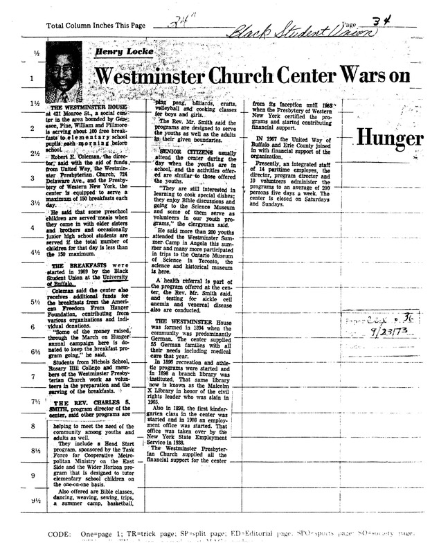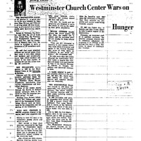 Photocopied newspaper clipping of The Spectrum? article "Westminster Church Center Wars on Hunger" by Henry Locke, November 16, 1974.