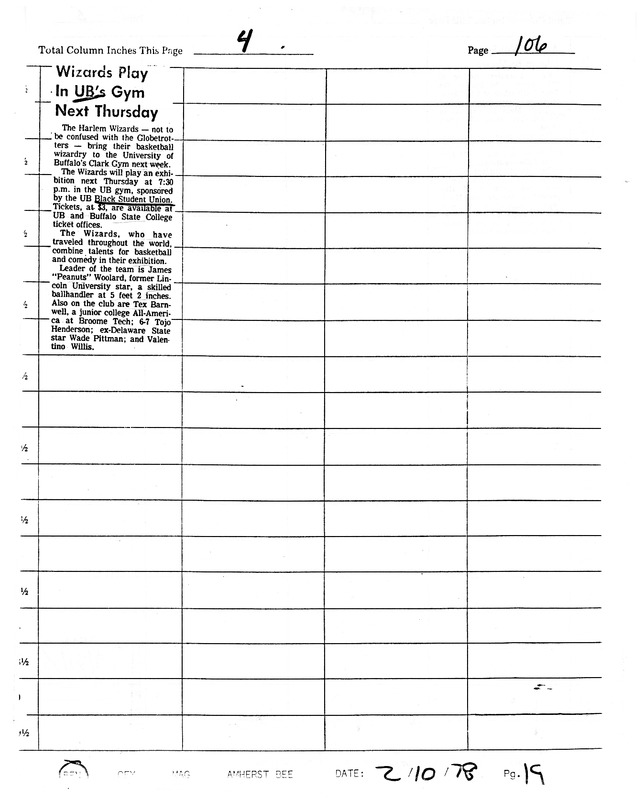 - Photocopied newspaper clipping of Buffalo Evening News article "Wizards Play In UB's Gym Next Thursday," February 10, 1978.