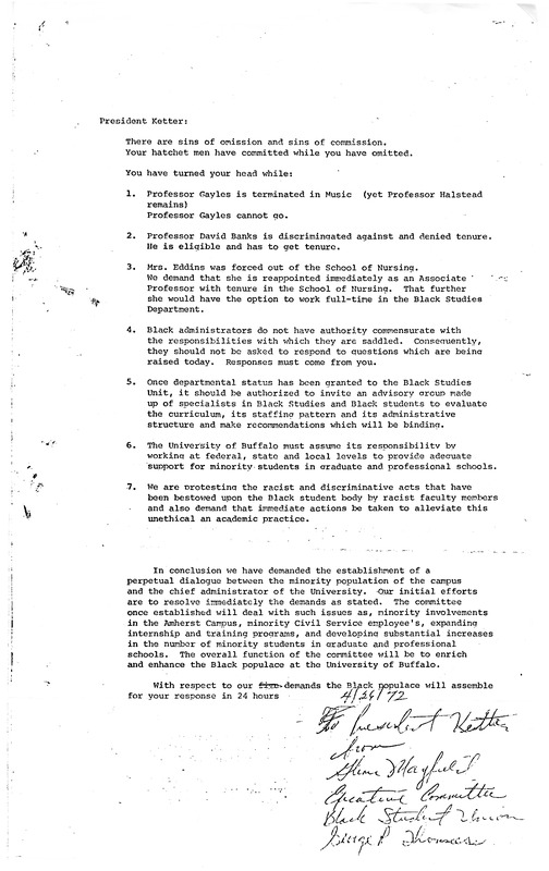 Typed letter to President Ketter from the Black Student Union, Executive Committee and others, April 24, 1972.