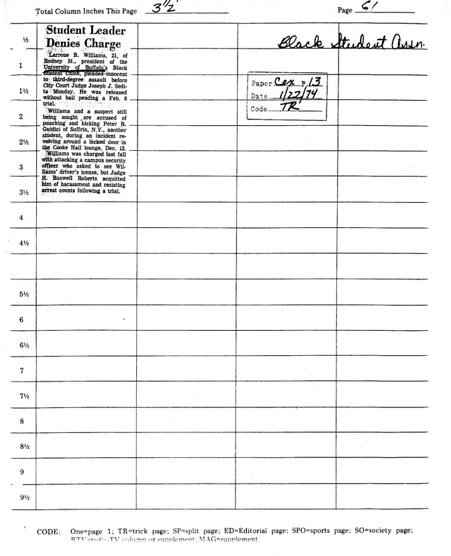 Photocopied newspaper clipping of Courier Express article "Student Leader Denies Charge," January 22, 1974.