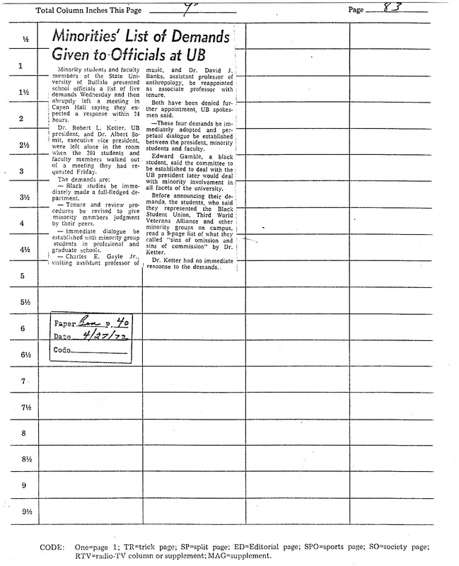 - Photocopied newspaper clipping of Buffalo Evening News article "Minorities' List of Demands Given to Officials at UB" April 27, 1972.