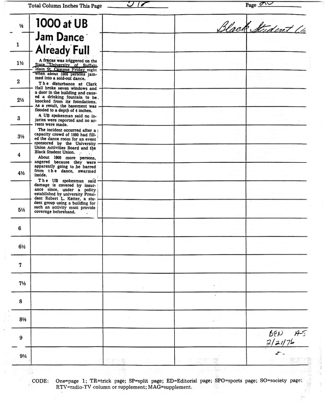 - Photocopied newspaper clipping of Buffalo Evening News article "1000 at UB Jam Dance Already Full," February 21, 1976.