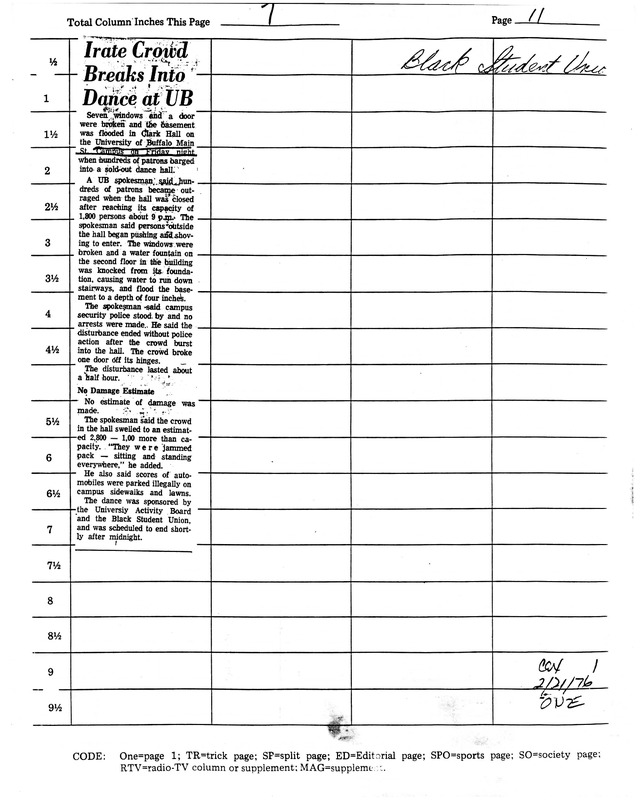 Photocopied newspaper clipping of Courier Express article "Irate Crowd Breaks Into Dance at UB," February 21, 1976.