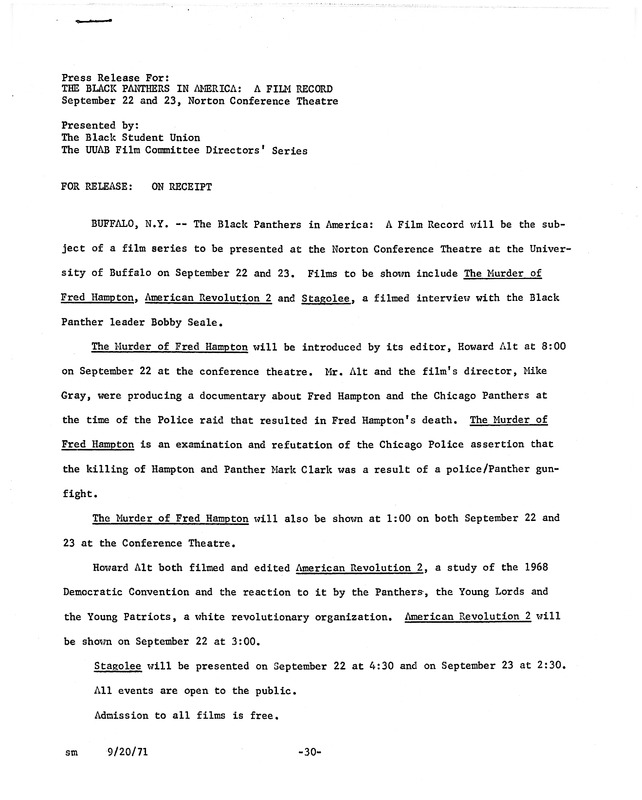 Press release for the screening of The Black Panthers In America for the Black Student Union's UUAB Film Committee Directors' Series, September 20, 1971.