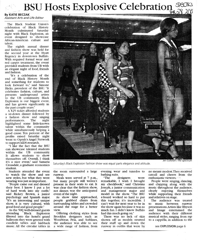 - Photocopied newspaper clippings of The Spectrum's article "BSU Hosts Explosive Celebration" by Katie Beczak, February 28, 2005.