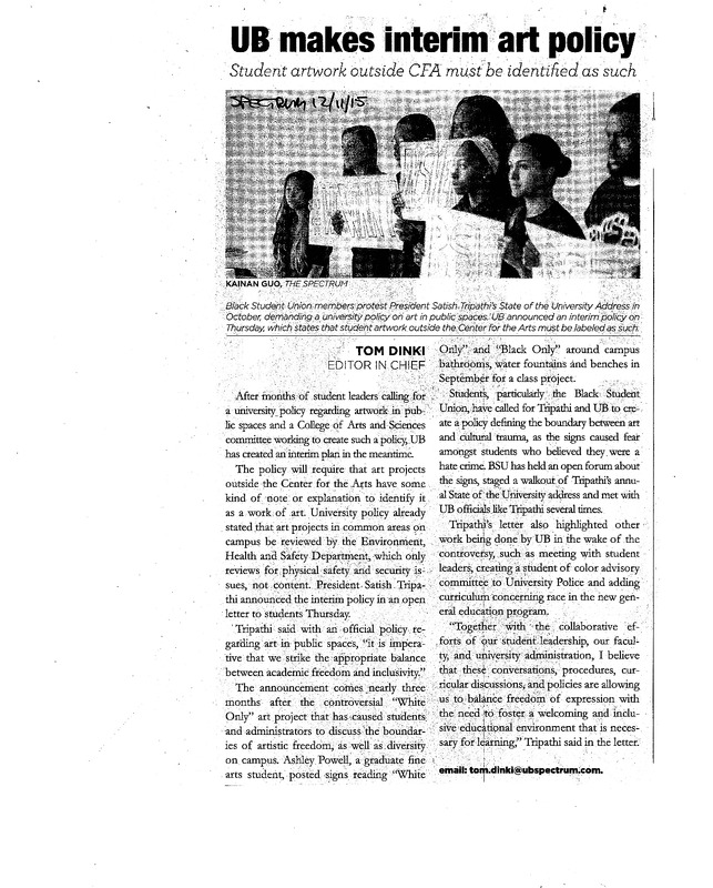 - Photocopied newspaper clipping of The Spectrum article "UB makes interim art policy" by Tom Dinki, December 11, 2015.