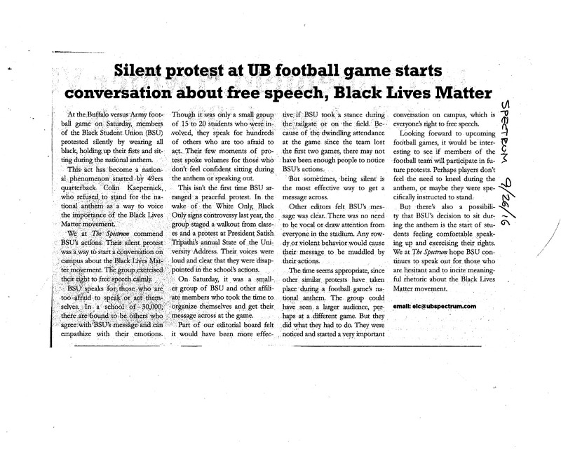 - Photocopied newspaper clipping of The Spectrum article "Silent protest at UB football game starts conversation about free speech, Black Lives Matter," September 26, 2016.