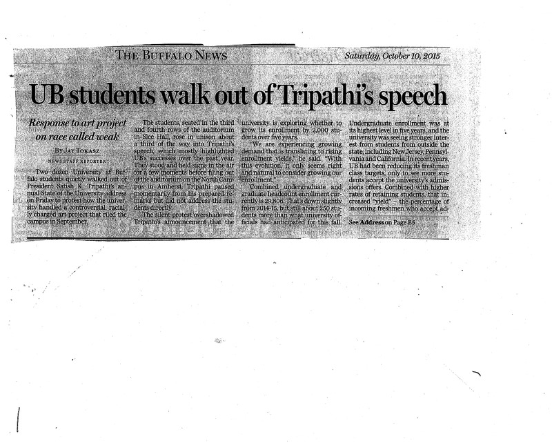 - Photocopied newspaper clippings of The Buffalo News article "UB Students walk out of Tripathi's speech Students felt hurt and confused" by Jay Tokasz, October 10, 2015.