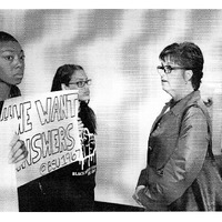 - Photocopied black and white photograph of students protesting at Lippes Concert Hall, Slee Hall on North Campus, October 9, 2015.