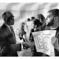 - Photocopied black and white photograph of group of Black Student Union e-board member James Battle with Buffalo mayor Byron Brown at a protest during President Tripathi's State of the University address in Slee Hall, October 9, 2015.