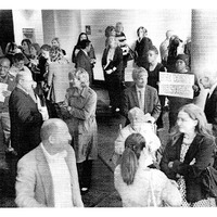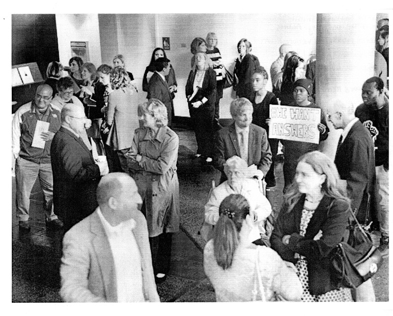 - Photocopied black and white photograph of students protesting at Lippes Concert Hall, Slee Hall on North Campus, October 9, 2015.