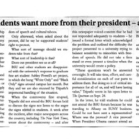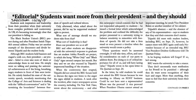 - Photocopied newspaper page of The Spectrum article "*Editorial* Students want more from their president -- and they should," October 12, 2015.