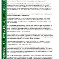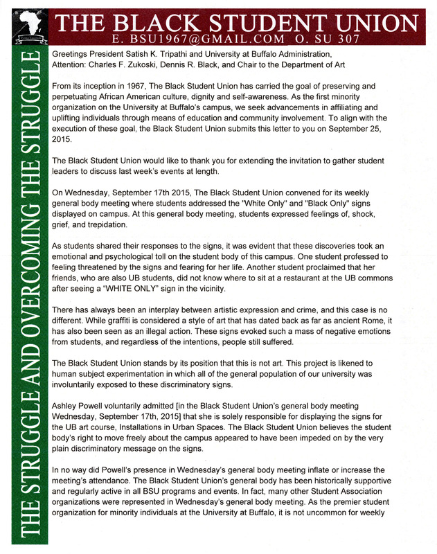 - Letter to President Tripathi from Black Student Union in response to student's art project, September 25, 2015.