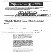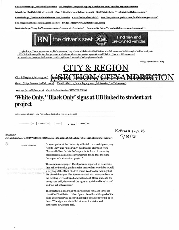- Photocopied pages from Buffalo News article "'White Only,' 'Black Only' signs at UB linked to student art project," September 16, 2015.